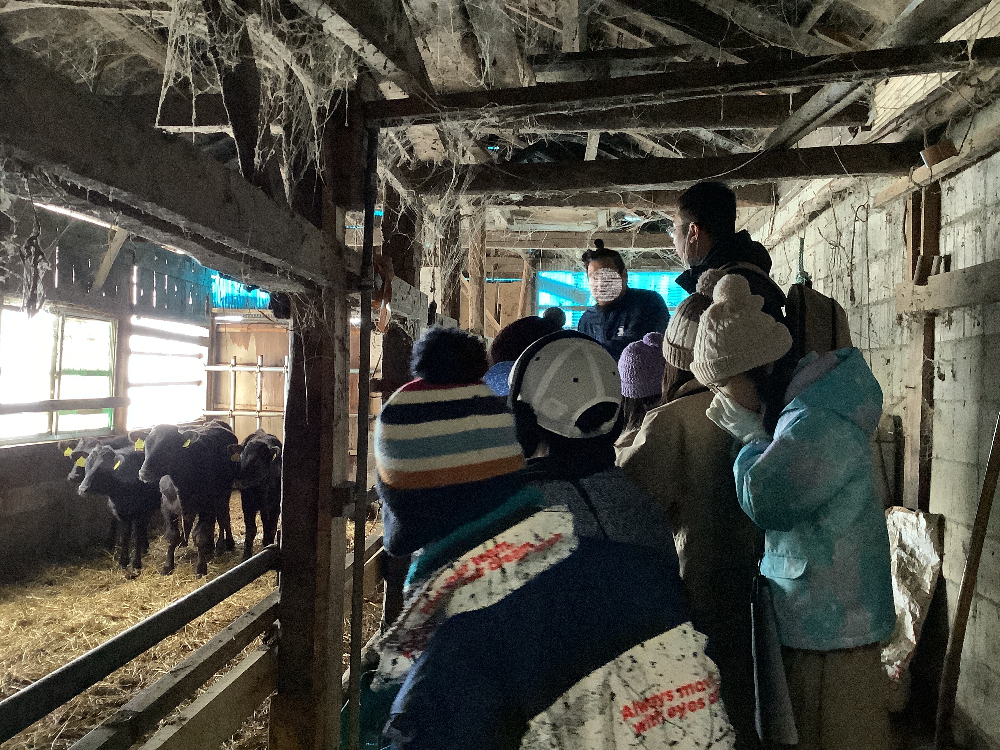 11月18日(火)に,3年生が「肉牛」の見学に行きました。場所は3年生の木村碧さんのお家が営む牧場です。これまで学習した「乳牛」と比較しながら,肉牛特有の見た目や品種の違い,育て方の違いや共通点を学びました。特に,餌の量の違いや赤ちゃん牛が最初に飲むミルクを大切にすること,そして,牛に愛情を持って接し,わずかな変化も見逃さない飼育者の工夫や努力についてのお話を聞きました。牛を育てるプロの仕事に触れることで,命をいただくことへの理解を深め,貴重な学びを得ることができました。
