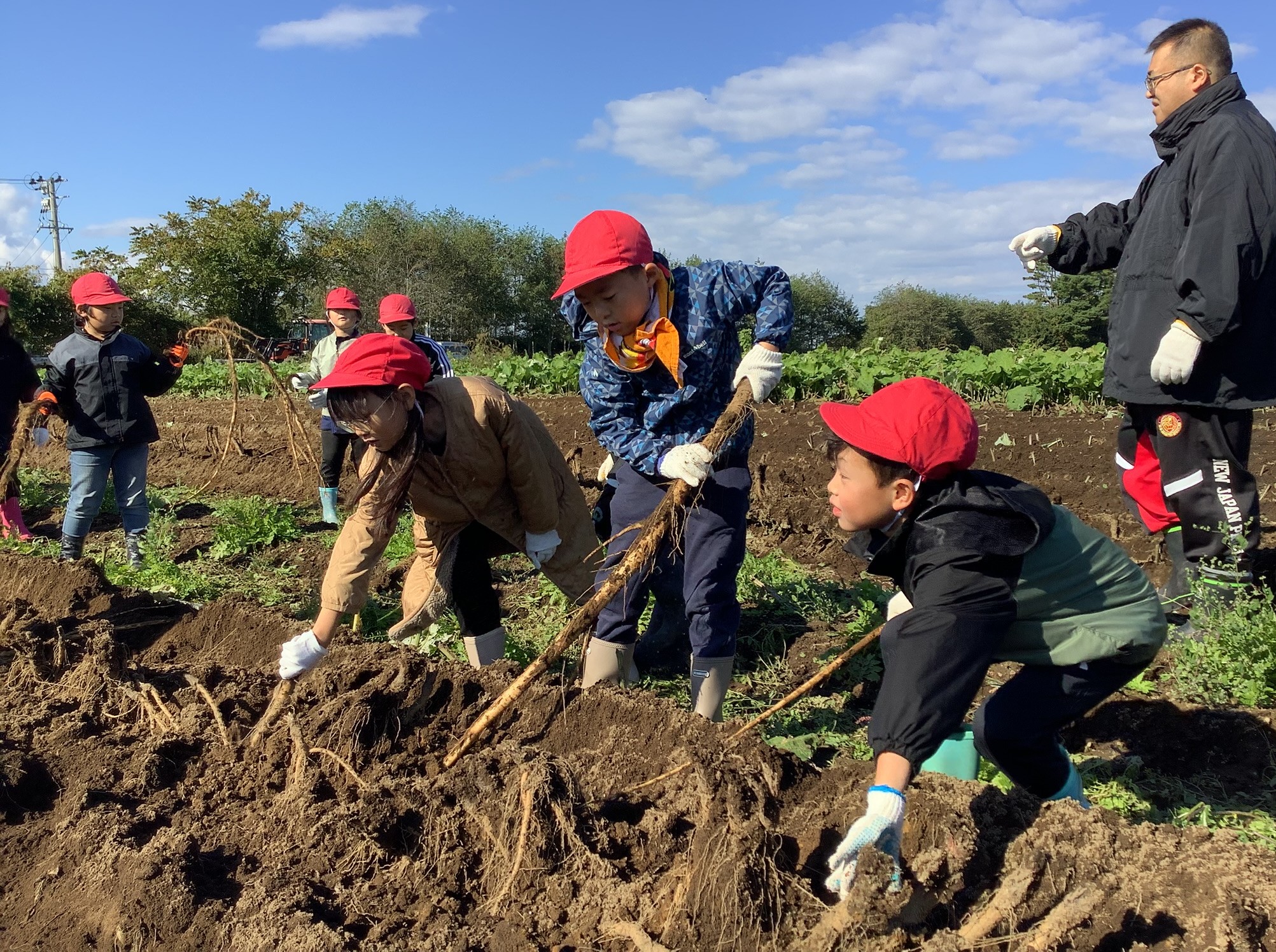 10月24日(金)に,六ヶ所村青年農業経営者協議会の皆様のご協力のもと,1・2学年が「ごぼう収穫体験」を行いました。場所は,南小学校正門の向かい辺りの畑です。まずは,収穫の仕方を詳しく教えていただき,それから収穫開始です。予め,抜きやすい状態に準備されていたので,子どもたちは「長〜い」「太〜い」などの声を発しながら,楽しそうに収穫していました。土まみれになりながら,一人30本ほど収穫したので,遊びではない本当の農作業をした感じでした。学校での勉強だけでは感じ得ない,貴重な体験となりました。