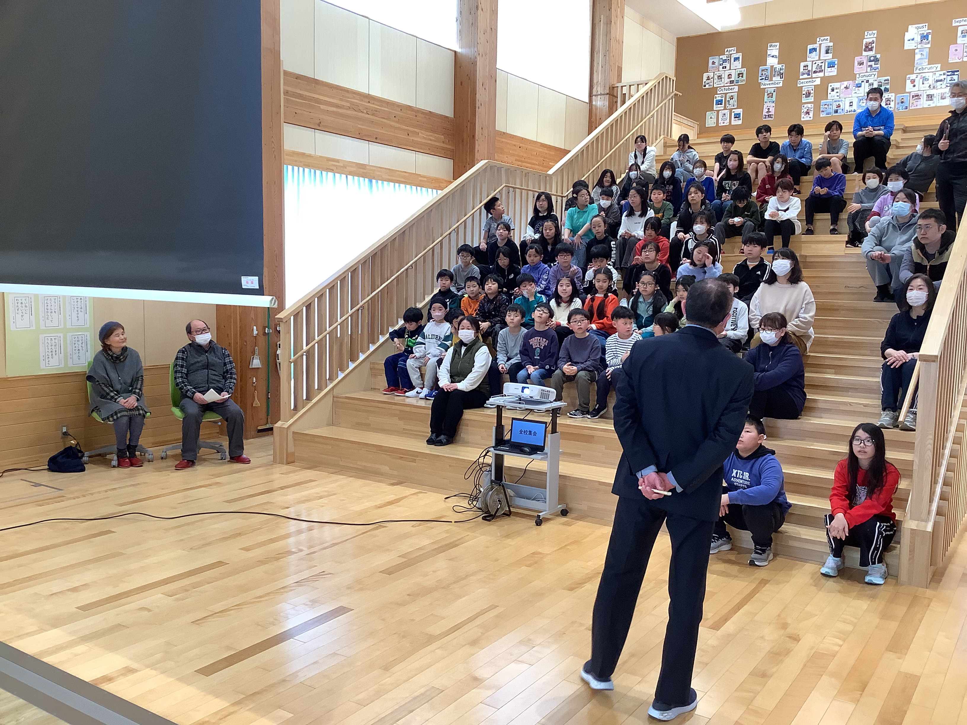 3月11日(水)に,今年度最後の全校集会を行いました。3月の全校集会は,いつも大階段で実施しています。理由は,体育館が卒業式の会場用に装飾され,ステージ上のスクリーンが使用できないからです。今回は,この3年間の全校集会で何を話した(見せた・行った)かを振り返りました。タンポポのことや星のこと,コンセントのことや暦にまつわること,漢字や物の数え方など様々です。実際に実験して見せたものも3回ありました。みんなそれぞれに印象に残っているものは違うようですが,全校集会での内容がこれからの生活・人生に少しでも役に立てば嬉しいですね。。